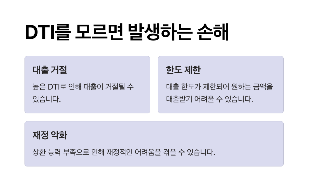 금융기관은 대출 신청자의 DTI를 통해 부채 상환 부담을 판단합니다. 높은 DTI는 상환 능력이 낮다고 간주되어 대출 승인이 거절되거나 낮은 한도의 대출만 가능해질 수 있습니다. - 리스크 관리: