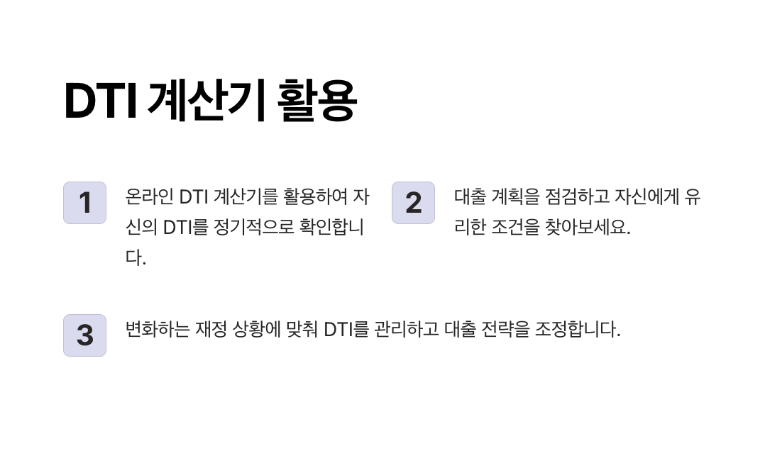 이번 글을 통해 DTI의 개념과 계산법, 관리 팁을 이해하셨다면, 앞으로 대출과 관련된 의사결정을 할 때 더욱 유리한 위치에 설 수 있을 것입니다. 간단하지만 놓치기 쉬운 DTI, 지금 자신의 비율을 확인하고 철저히 관리해 보시길 바랍니다.