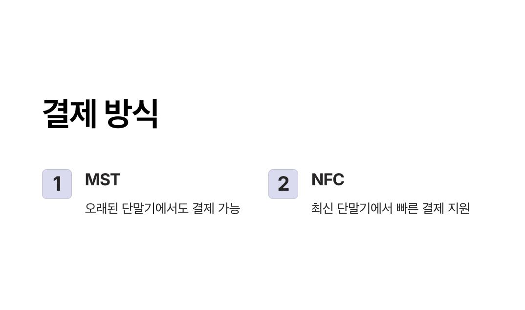 - 광범위한 호환성: MST와 NFC 두 가지 기술을 모두 지원해 대부분의 카드 단말기에서 사용 가능합니다.