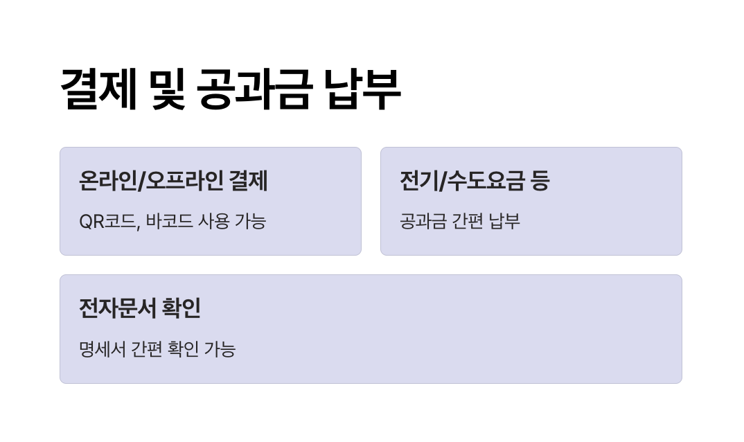 - 전기요금, 수도요금, 지방세 등 고지서를 전자문서로 받아보고 클릭 한 번으로 결제.