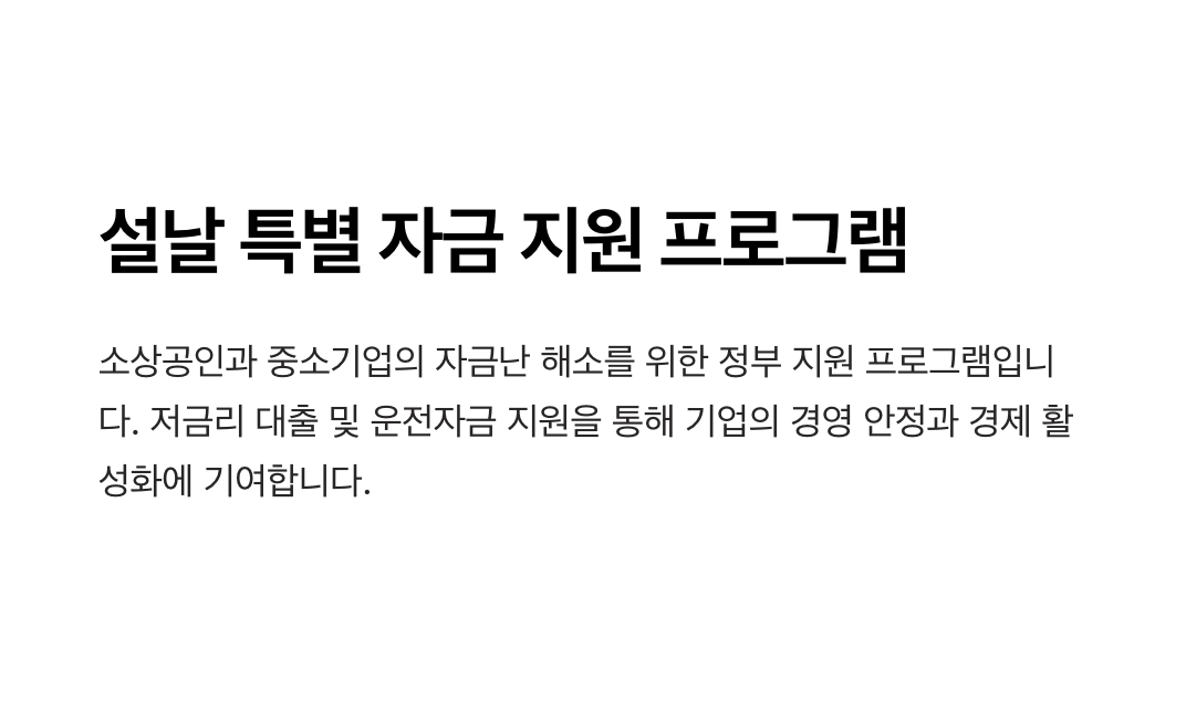 | 3. 소상공인 정책자금 포털 | 소상공인 대상 설날 특별 자금 신청 정보를 제공하며, 신청 대상과 지원 내용에 대한 상세 안내가 포함되어 있습니다. |