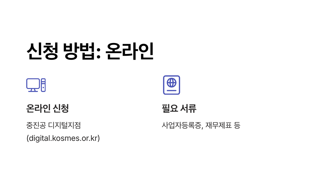 - 전국에 위치한 중진공 지점을 방문하여 신청할 수 있습니다.