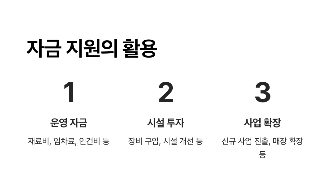 - A4. 자금은 사업 운영과 관련된 목적으로만 사용할 수 있습니다. 예를 들어, 물품 구입비, 임대료, 인건비 등의 경영 안정 목적이 허용됩니다.