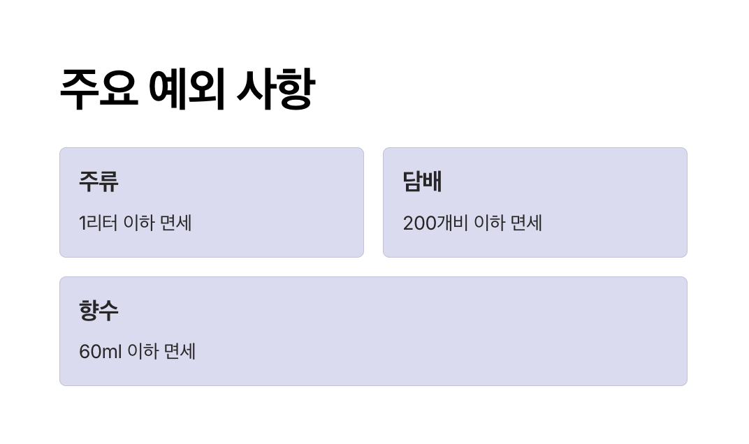 주의: 면세 한도를 초과할 경우 초과 금액뿐 아니라 전체 금액에 대해 과세됩니다. 따라서 총 결제 금액과 수량 제한을 동시에 확인하는 것이 중요합니다.