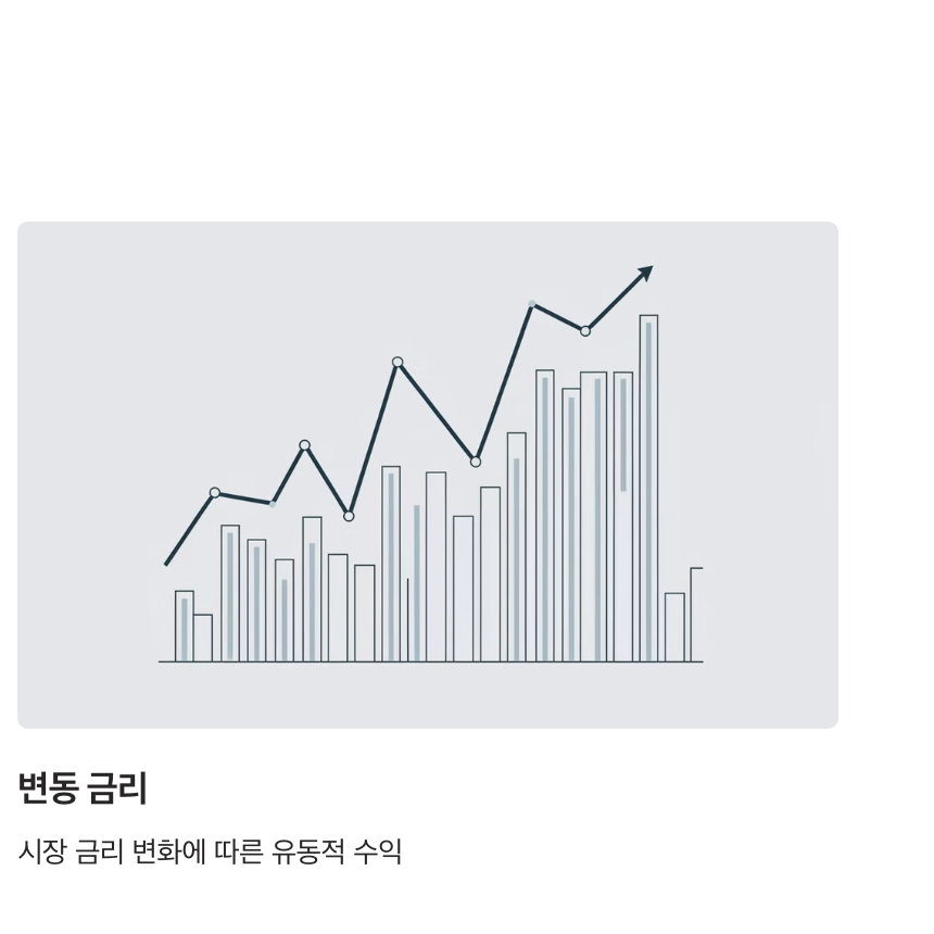 - 변동 금리: 시장 금리에 따라 금리가 변동되며 금리 상승기에 높은 수익을 기대할 수 있습니다. 다만 금리 하락 시 수익이 줄어들 수 있다는 단점이 있습니다.