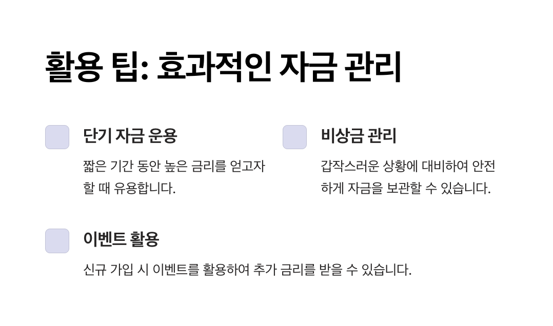 - 단기 여유 자금: 3개월 이내 사용하지 않을 자금을 효과적으로 운용할 수 있습니다.