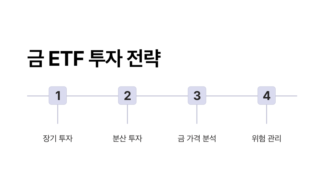 금 ETF는 단독 투자보다는 주식, 채권 등과 함께 분산 투자하는 것이 리스크 관리에 유리합니다. 금의 가격이 하락하더라도 다른 자산에서 발생한 수익으로 손실을 보완할 수 있습니다.