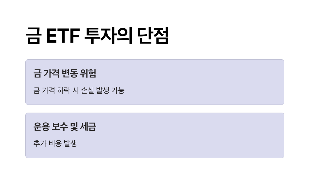 국내 금 ETF의 경우 매매차익에 대해 배당소득세가 부과되므로 세금을 고려한 수익 계산이 필요합니다. 또한 운용 보수와 증권사 매매 수수료도 반드시 고려해야 합니다.