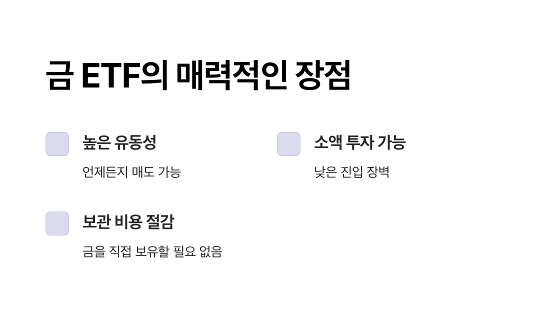 금 ETF는 금을 실물로 보유하지 않아도 금 가격에 따라 수익을 얻을 수 있는 효율적인 금융 상품입니다. 높은 유동성과 간편한 매매 방식은 금 ETF의 가장 큰 장점이며, 금을 직접 소유하지 않아도 보관과 안전성에 대한 부담이 적습니다.