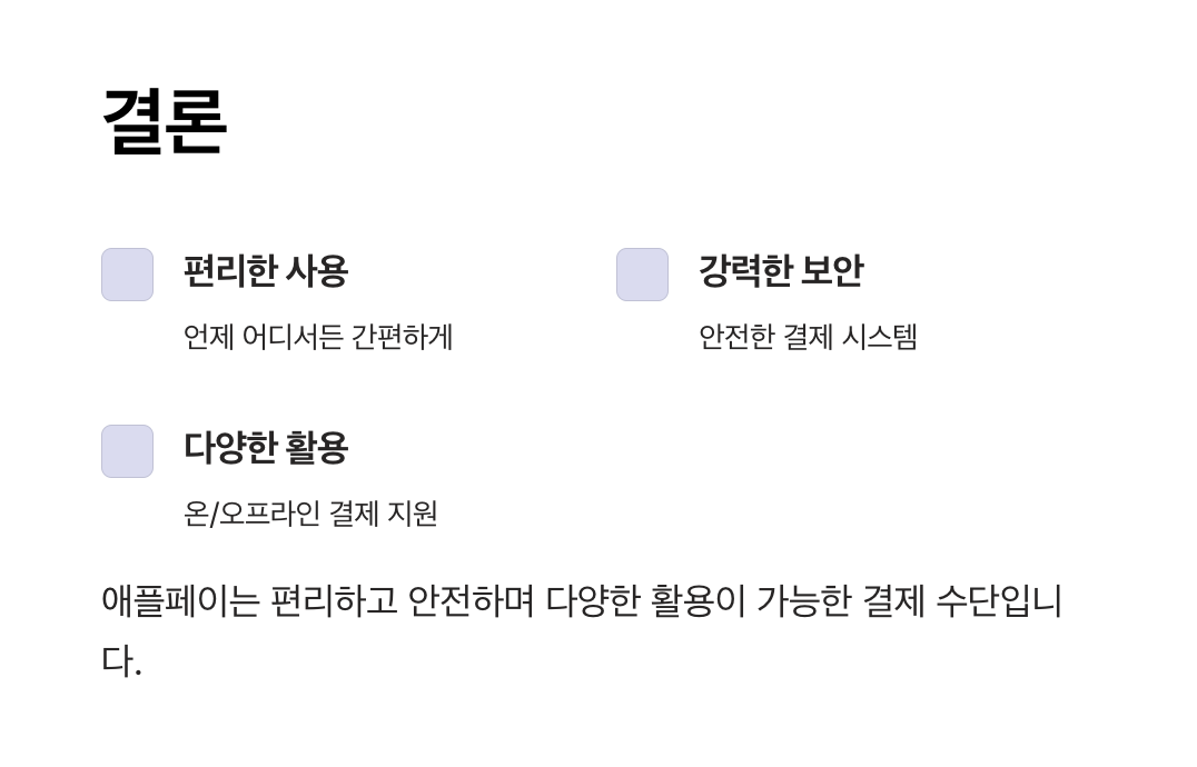 편리함과 보안성이 애플페이의 가장 큰 장점으로, Face ID나 Touch ID로 빠르고 안전하게 결제할 수 있습니다. 이번 가이드에서 애플페이 사용법을 단계별로 배워 스마트 결제의 편리함을 직접 느껴보시기 바랍니다.