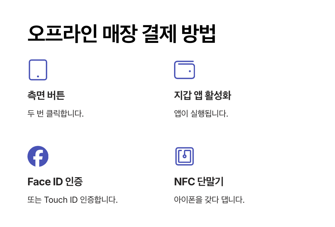 - NFC 단말기에 아이폰 대기: 아이폰 상단을 결제 단말기에 가까이 대면 자동으로 결제가 진행됩니다.