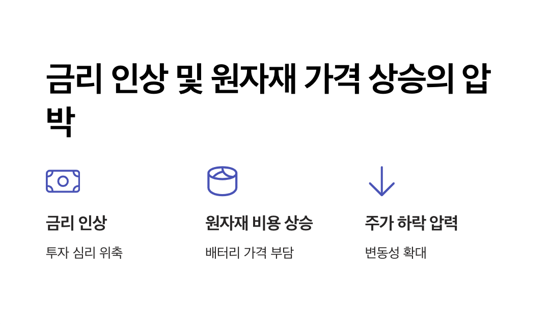- 배터리 핵심 원자재(리튬, 니켈) 가격 상승으로 제조 비용 증가.
