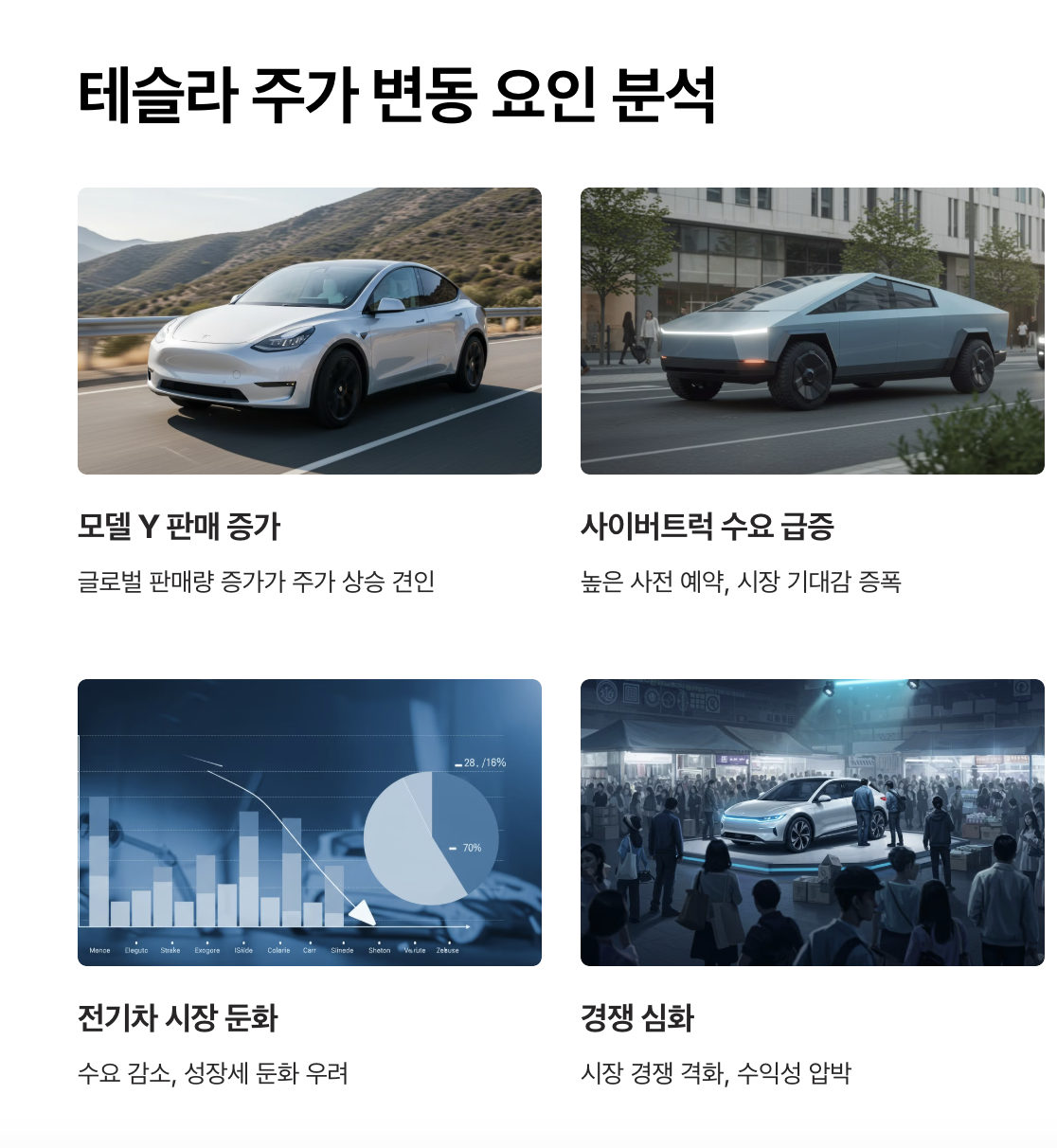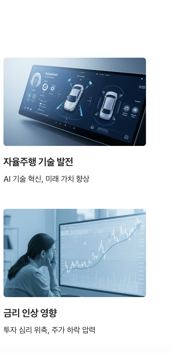 테슬라 주가 변동에는 전기차 시장 성장 둔화, 금리 인상, AI & 자율주행 기술 발전, 경쟁 심화 등의 요인이 작용했습니다. 특히 연준(Fed)의 금리 정책, 배터리 원자재 가격 상승, 중국 시장에서의 테슬라 판매 둔화 등이 하락 요인으로 작용했으며, 반면 에너지 사업 확장, 자율주행 기술 개발, 사이버트럭 출시 등이 상승 모멘텀을 제공했습니다.