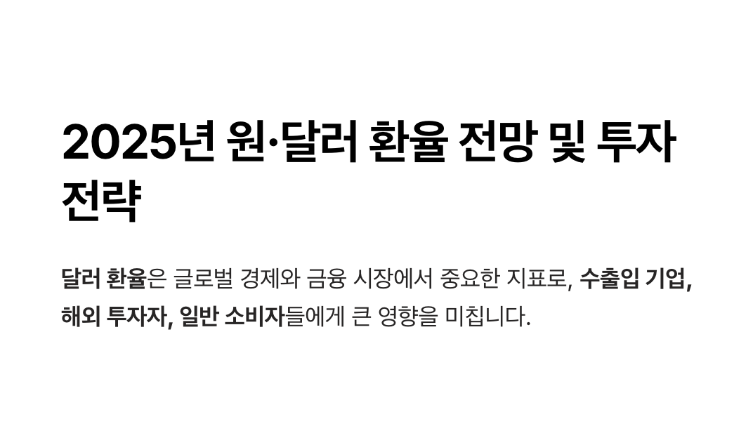 이번 글에서는 2025년 달러 환율 전망과 변동 요인을 살펴보고, 경제 전문가들의 예측과 함께 환율 변동에 따른 투자 전략 및 대처법을 알아보겠습니다.