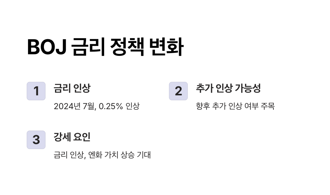 일본은행(BOJ)은 장기간 초저금리 정책을 유지해왔으며, 이는 엔화 약세의 주요 원인 중 하나였습니다.