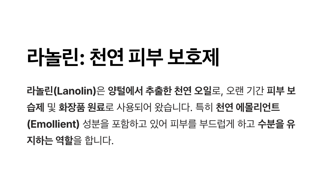 라놀린은 천연 성분이면서도 강력한 보습 효과를 지니고 있어, 건조한 피부나 손상된 피부 관리에 매우 유용한 성분입니다. 피부 장벽 강화, 수분 손실 방지, 피부 재생 등의 효과를 제공하지만, 알레르기 반응이나 모공 막힘 등의 라놀린 부작용이 발생할 가능성이 있으므로 사용 전 패치 테스트가 필요합니다.