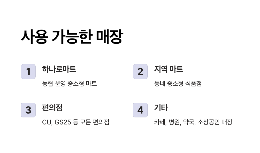 - 하나로마트, 농협마트, 지역 슈퍼마켓 등 중소형 마트 및 로컬 마트에서 사용 가능합니다.