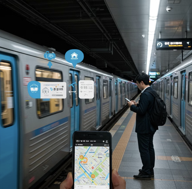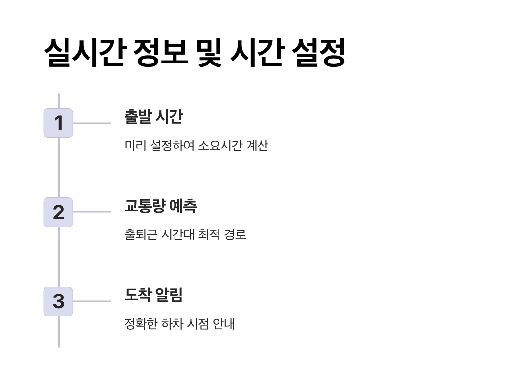 - 대중교통 정보 제공: 버스 및 지하철 환승 정보, 첫차·막차 시간, 실시간 도착 정보 지원