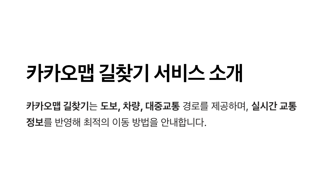 카카오맵 길찾기는 도보, 차량, 대중교통 경로를 제공하며, 실시간 교통 정보를 반영해 최적의 이동 방법을 안내합니다. 출발지와 도착지 설정 후 예상 소요 시간과 거리 비교가 가능하며, 경유지 추가, 도착 알림, 즐겨찾기 기능 등 다양한 편의 기능을 제공합니다.