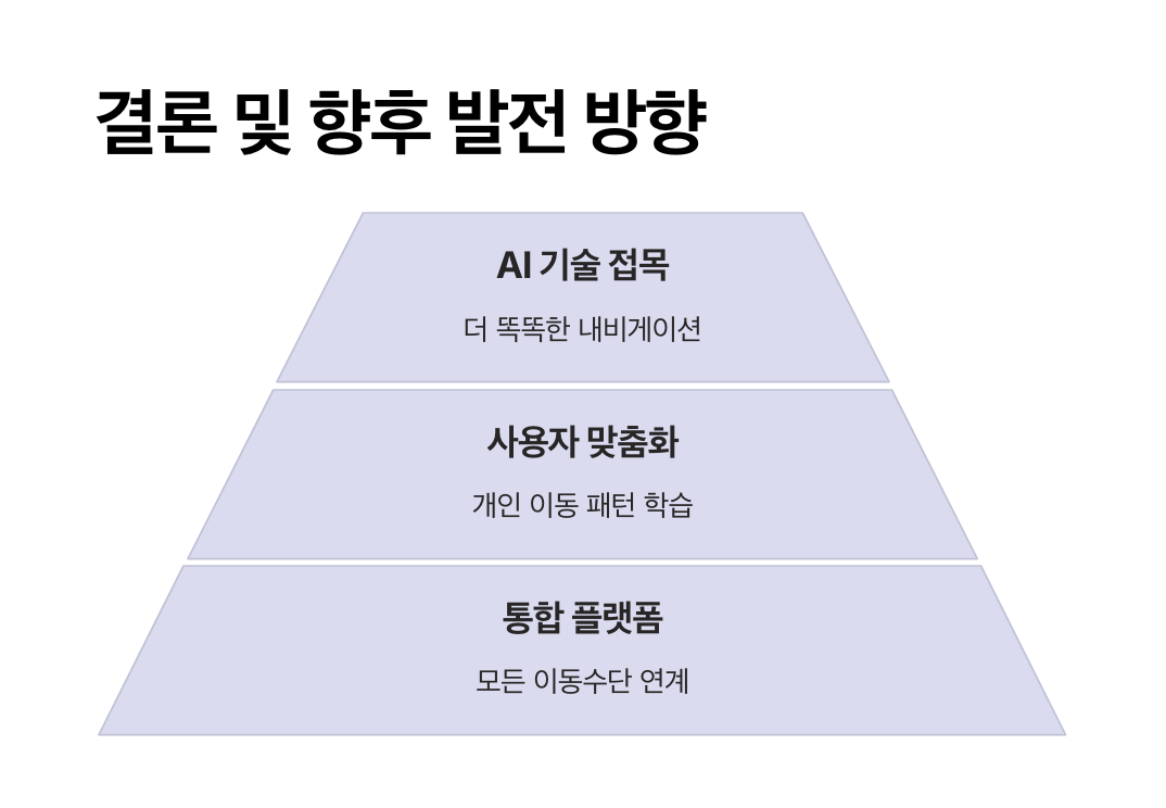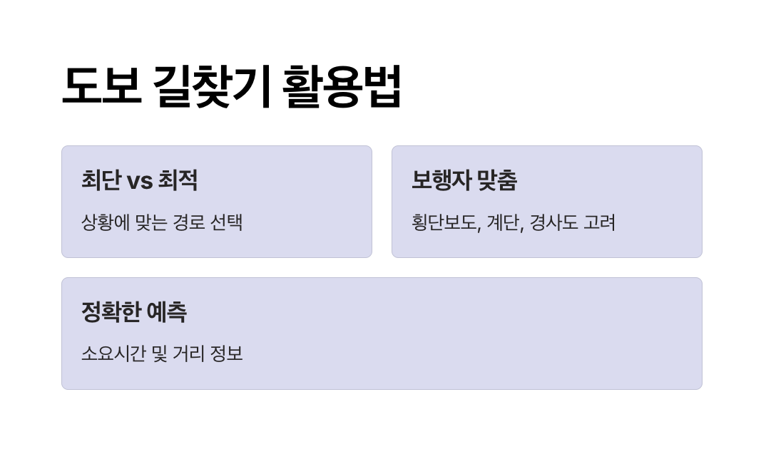 - 도보 경로 맞춤 안내: 계단 여부, 경사도 등 보행자 친화적 경로 제공