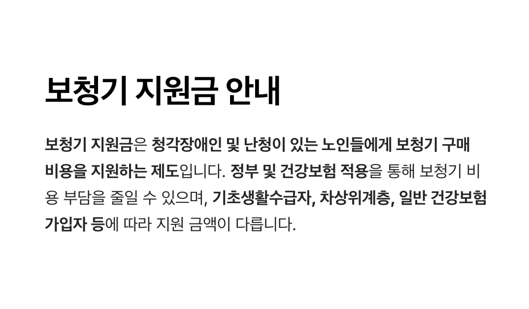 보청기 지원금은 청각장애인 및 난청이 있는 노인들에게 보청기 구매 비용을 지원하는 제도입니다. 정부 및 건강보험 적용을 통해 보청기 비용 부담을 줄일 수 있으며, 기초생활수급자, 차상위계층, 일반 건강보험 가입자 등에 따라 지원 금액이 다릅니다.