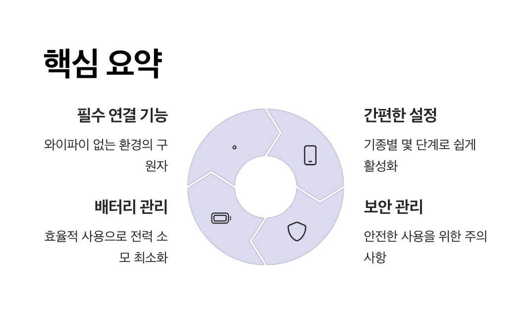 와이파이 핫스팟 기능은 매우 유용하지만, 무분별하게 사용할 경우 배터리 소모, 데이터 과다 사용, 보안 위험 등이 발생할 수 있습니다. 아래는 실전에서 꼭 알아두어야 할 꿀팁과 주의사항입니다.