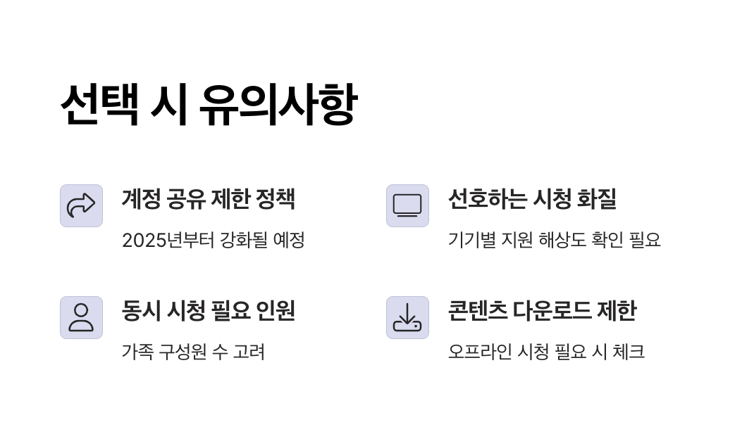 화질, 동시 시청 인원, 광고 포함 여부, 그리고 계정 공유 제한 정책 등 여러 요소를 함께 고려해야 실제 이용 만족도가 높아집니다.