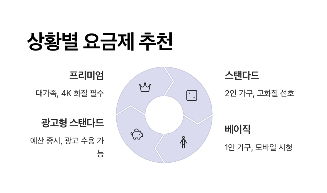 혼자서 모바일로 짧게 즐긴다면 베이직 요금제, 2인이 함께 보고 가격을 아끼고 싶다면 광고형 스탠다드, 고화질로 온 가족이 본다면 프리미엄 요금제가 적합합니다.