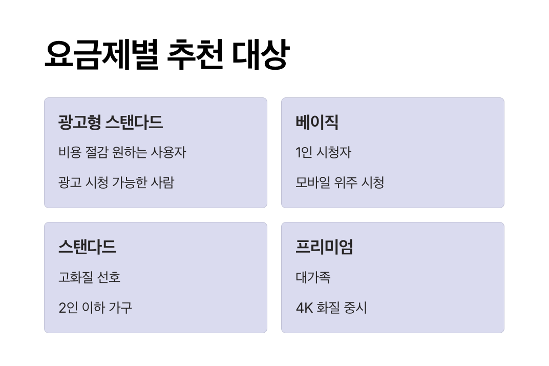| 프리미엄 | 17,500원 | UHD (4K) | 4명 | 없음 | 4대 가능 | 가족 단위, 고화질 시청 선호자 |