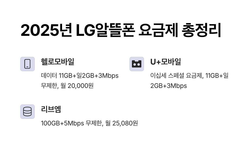아래는 2025년 3월 기준으로 출시된 주요 LG알뜰폰 요금제 비교표입니다. 데이터, 통화, 가격, 부가혜택을 기준으로 정리했습니다.