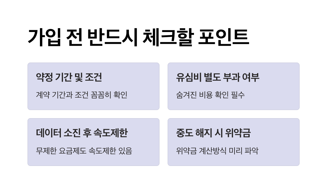 LG알뜰폰 요금제는 가성비가 뛰어나지만, 가입 전 반드시 확인해야 할 조건들도 있습니다. 단순히 월 요금만 보고 선택했다가, 약정이나 해지 위약금 때문에 예상보다 많은 비용이 나오는 경우도 있으니 주의가 필요합니다.