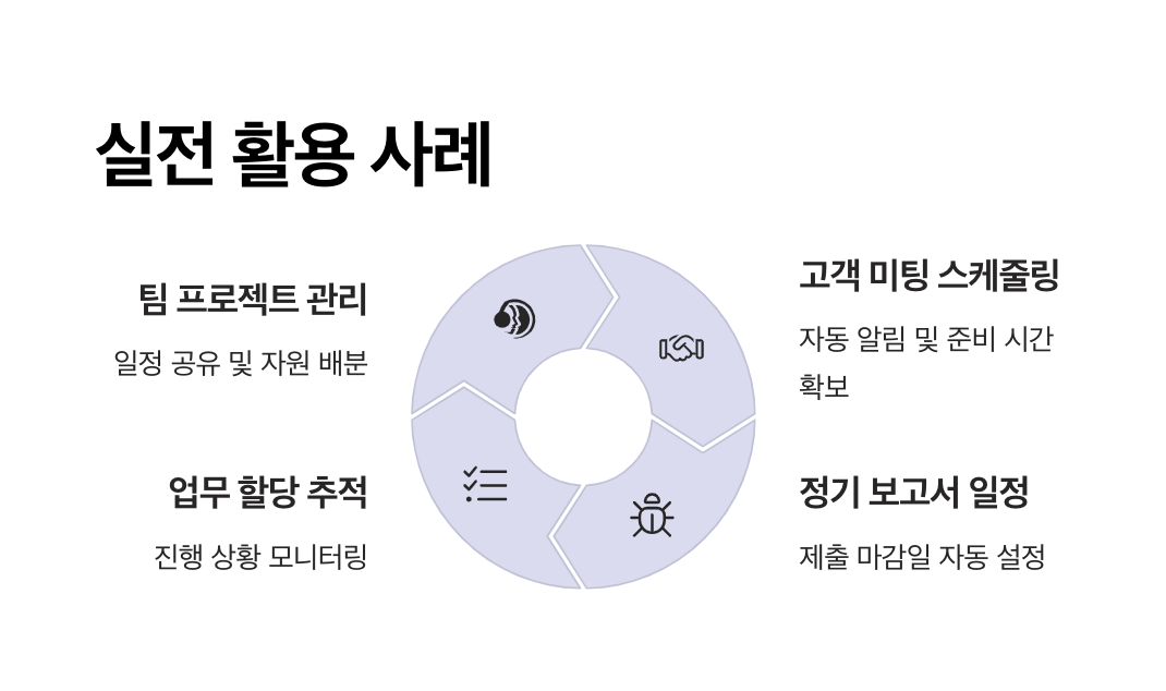 | 캘린더 | 일정 등록, 반복 설정, 회의 초대, 알림 기능 | 주간 일정표 작성, 미팅 자동 알림 |