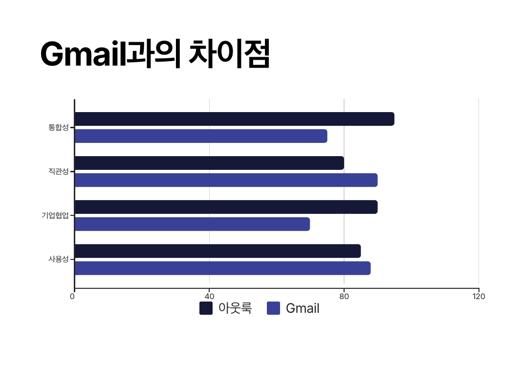 - Outlook은 전통적인 폴더 기반 정리를 유지하면서도 메일, 일정, 작업 기능이 하나의 화면에 통합되어 있어 업무용에 더 최적화된 구조입니다.