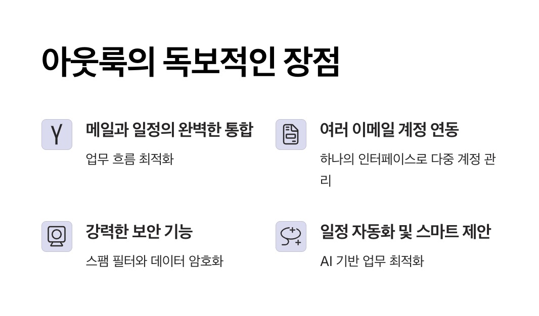 특히 기업이나 조직에서는 아웃룩의 일정 공유, 미팅 자동 예약, 부서 간 메일 분류 등의 기능 덕분에 협업과 커뮤니케이션 효율성을 높일 수 있어 널리 사용됩니다. 현재는 전 세계 수억 명이 사용하는 대표적인 비즈니스 이메일 플랫폼 중 하나로 자리 잡고 있습니다.