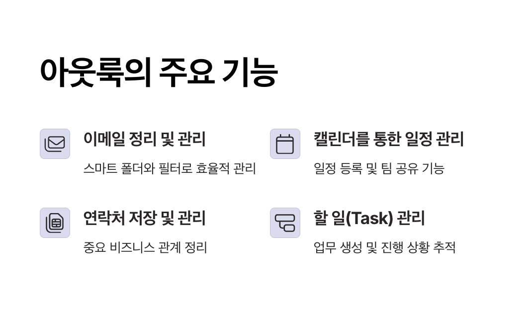 | 조직 내 활용 | 부서 간 일정 공유, 메일 자동 분류, 회의 초대 및 캘린더 연동 |
