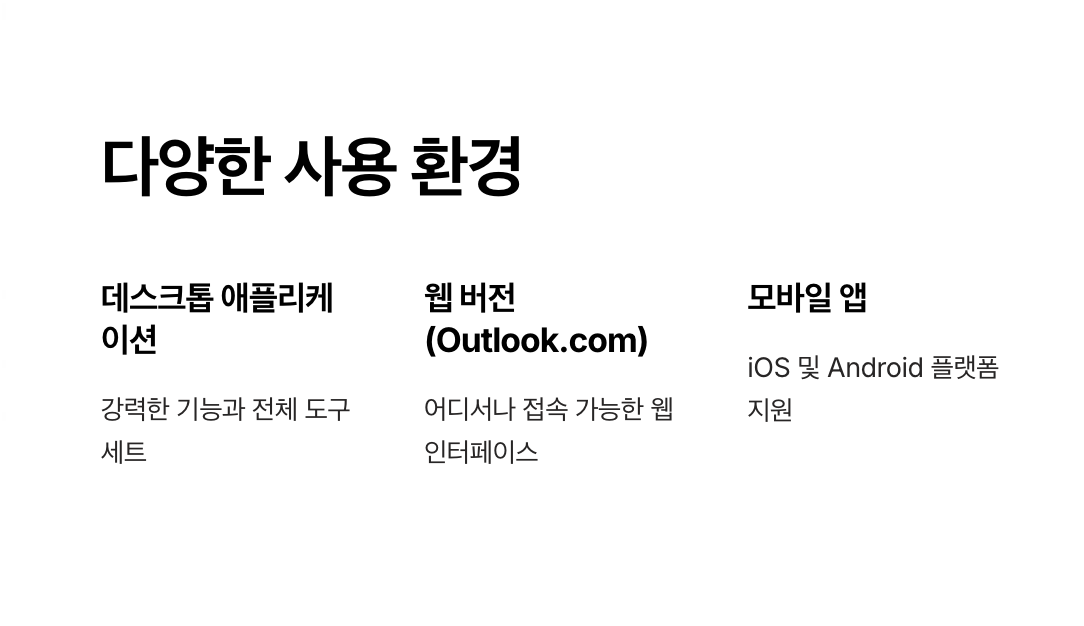 사용 환경 | 데스크톱 앱(오피스), 웹 버전(Outlook.com), 모바일 앱(iOS/Android) |