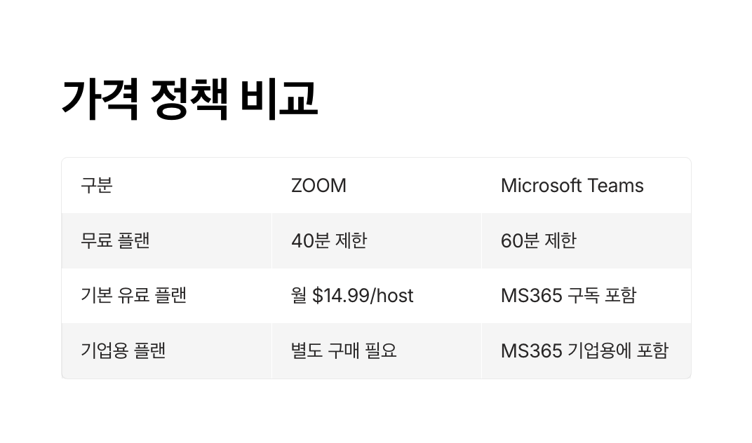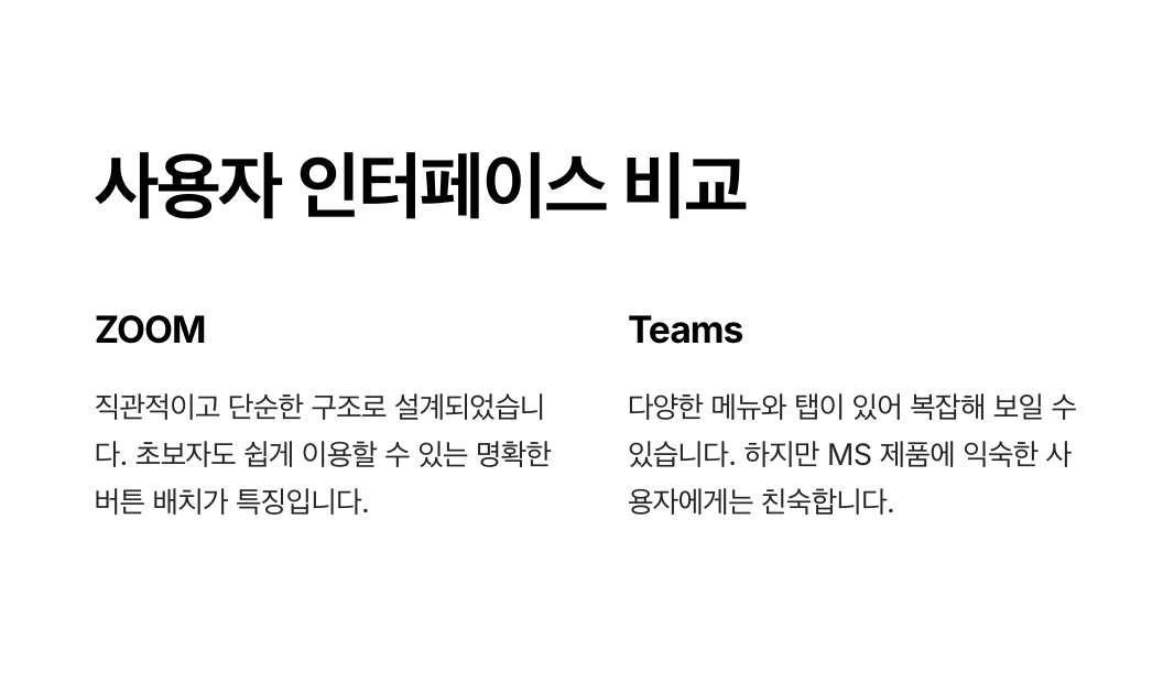 | 비교 항목 | ZOOM | Microsoft Teams |