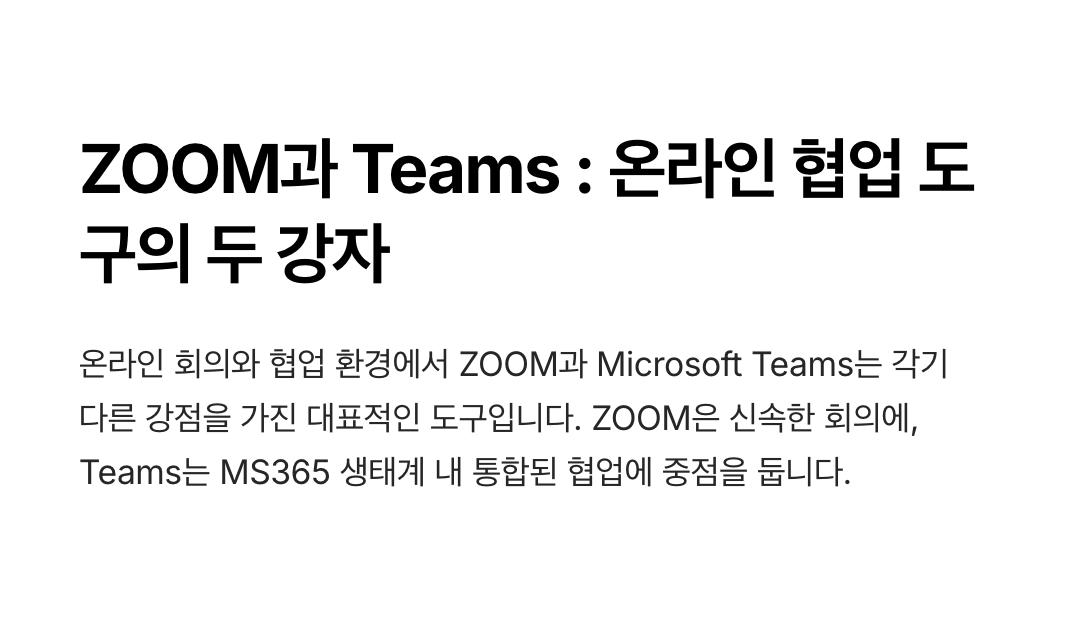 결론적으로, ZOOM은 회의 중심 툴, Teams는 협업 중심 통합 플랫폼이라 할 수 있습니다. 사용 목적이 무엇인지에 따라 선택이 달라져야 합니다.