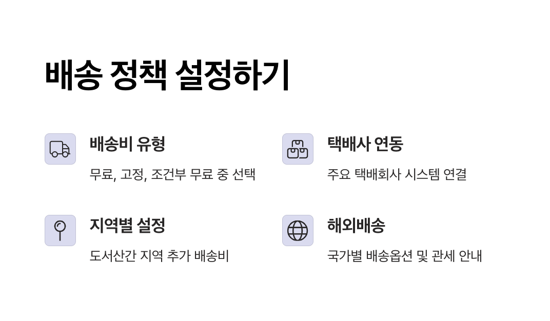 상품을 등록하고 결제까지 완료됐다면 이제는 배송 정책을 세팅할 차례입니다. 고객은 상품을 받는 마지막 과정까지 불편함 없이 경험하길 원하기 때문에, 카페24 쇼핑몰 구축에서는 배송 설정이 매우 중요합니다.