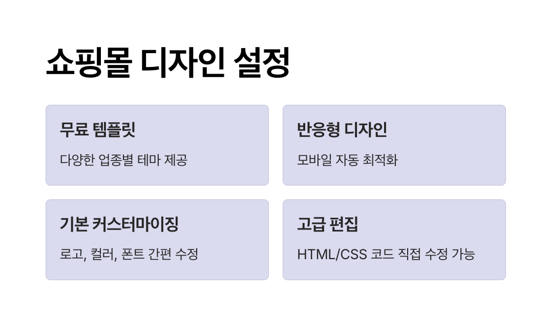 HTML/CSS 지식이 있다면 ‘프로모드’를 활용해 고급 디자인 수정도 가능합니다. 다만 초보자는 ‘스마트모드’에서 제공하는 시각적 편집기로 충분히 멋진 쇼핑몰을 만들 수 있습니다.