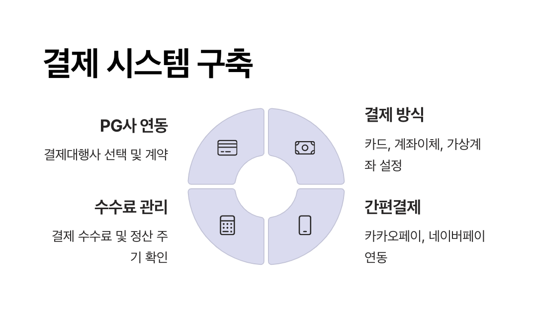 카페24에서는 다양한 PG사(Payment Gateway)와 손쉽게 연동할 수 있으며, 카드 결제, 계좌이체, 간편결제(카카오페이, 네이버페이 등)를 지원합니다.