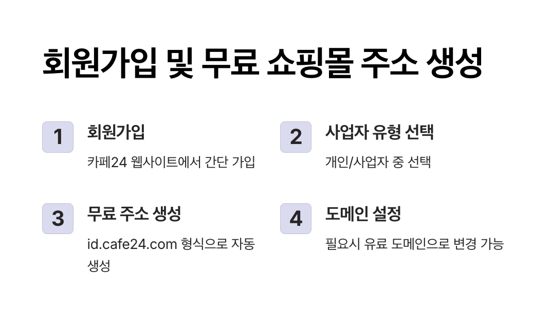 카페24 쇼핑몰 구축의 첫걸음은 회원가입입니다. 누구나 무료로 가입할 수 있으며, 가입 직후 곧바로 무료 쇼핑몰을 개설할 수 있습니다. 이 과정을 차근차근 따라가면, 별도의 개발 지식 없이도 나만의 쇼핑몰을 만들 수 있습니다.