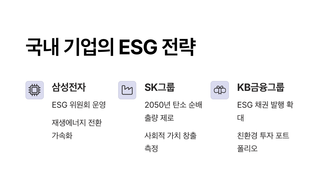 | 주요 전략 | 기후 중립 선언, 지속가능 보고서, 공급망 관리 강화 | ESG 위원회 신설, 친환경 투자 확대, RE100 가입 |