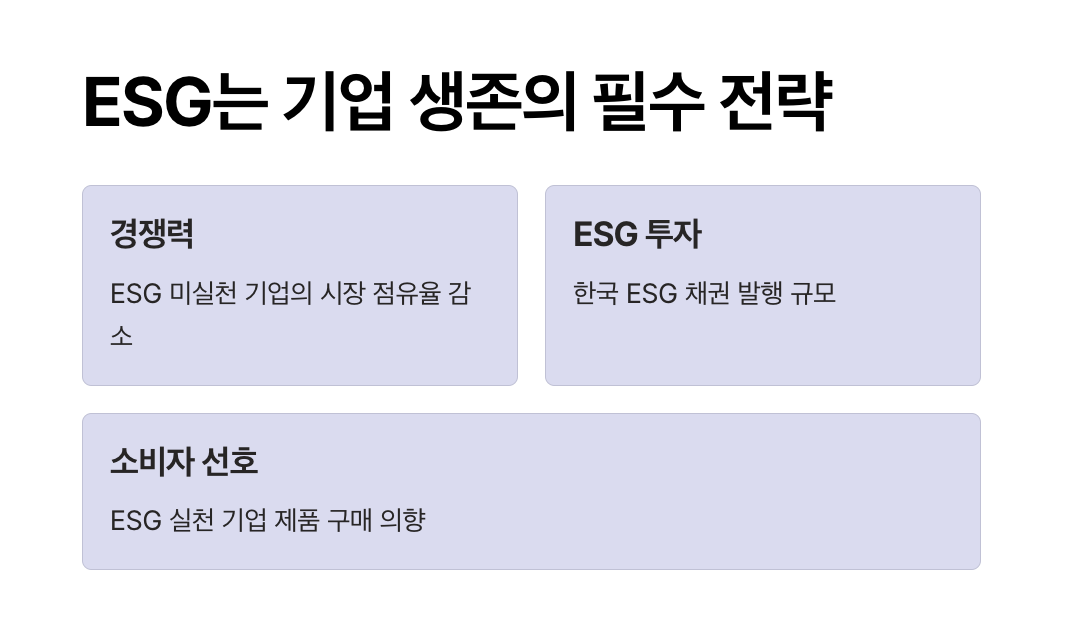 즉, ESG를 고려하지 않는 기업은 투자자에게 외면받고, 소비자에게 신뢰를 잃으며, 글로벌 시장에서도 경쟁에서 뒤처질 수밖에 없습니다.