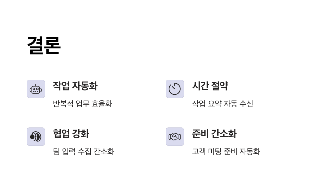 효과: 회의록 작성 시간 90% 절감 + 정보 누락 최소화