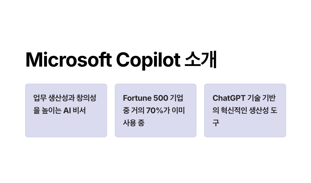 Microsoft Copilot은 마이크로소프트가 Microsoft 365 환경에 탑재한 AI 비서 기능으로, 업무 생산성을 높이는 데 중점을 둔 생성형 인공지능 도구입니다.