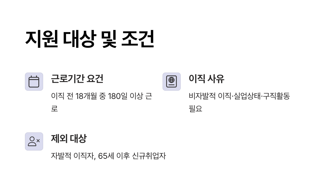 지원 대상은 피보험기간이 180일 이상인 근로자로, 자발적 이직이나 중대한 귀책 사유가 있는 경우에는 수급이 제한됩니다.