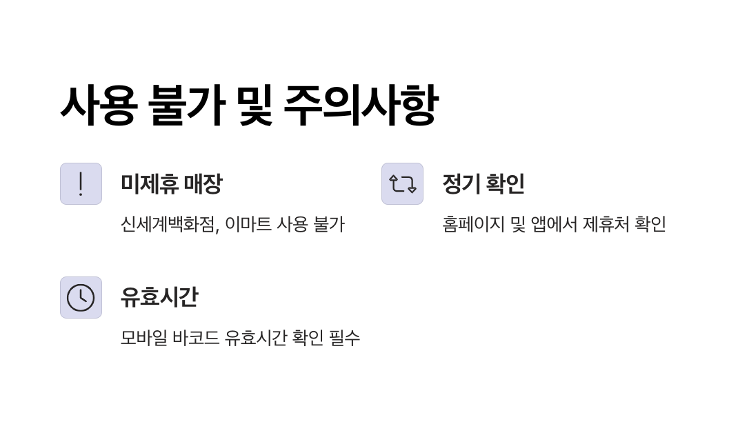 • 사용처 목록이 길어 외워두기 어렵다면, 자주 이용하는 매장만이라도 즐겨찾기해 두거나 스크린샷을 저장해 두면 편리합니다.