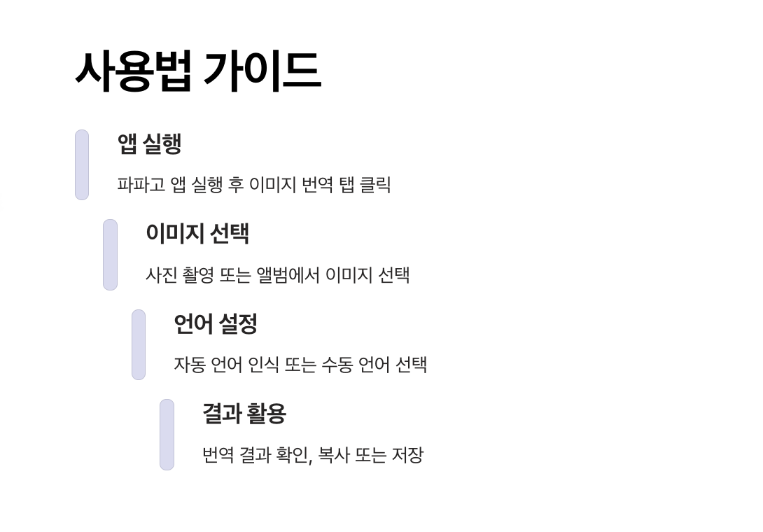| 파파고 도움말 센터 – 이미지 번역 사용법 안내 | 이미지 번역 포함 파파고의 주요 기능과 설정 방법에 대해 자세히 설명된 공식 도움말입니다. 인식 오류나 언어 감지 실패 등 문제 해결 팁도 포함되어 있습니다. |