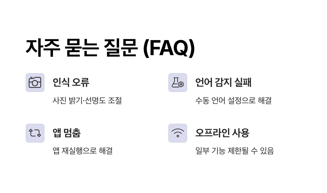 - 사진에 글자가 너무 작거나 흐리면 번역이 잘 되지 않을 수 있으니, 가급적 글자가 큼직하게 나오도록 찍어주세요.